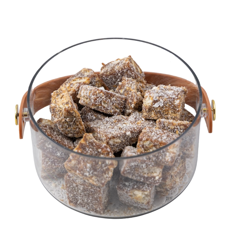 استمتع بقطع البسكويت الشهية، مصنوعة من مكونات طبيعية مختارة تمر طبيعيا، بسكويت شاي، زبدة، وجوز هند مبشور لنكهة غنية ومميزة حلوى شرقية تقليدية مثالية كوجبة خفيفة مع الشاي أو القهوة، تجمع بين حلاوة التمر الطبيعية وقرمشة البسكويت مع لمسة جوز الهند العطرية تقدم في وعاء زجاجي أنيق لضيافة فاخرة ولذيذة